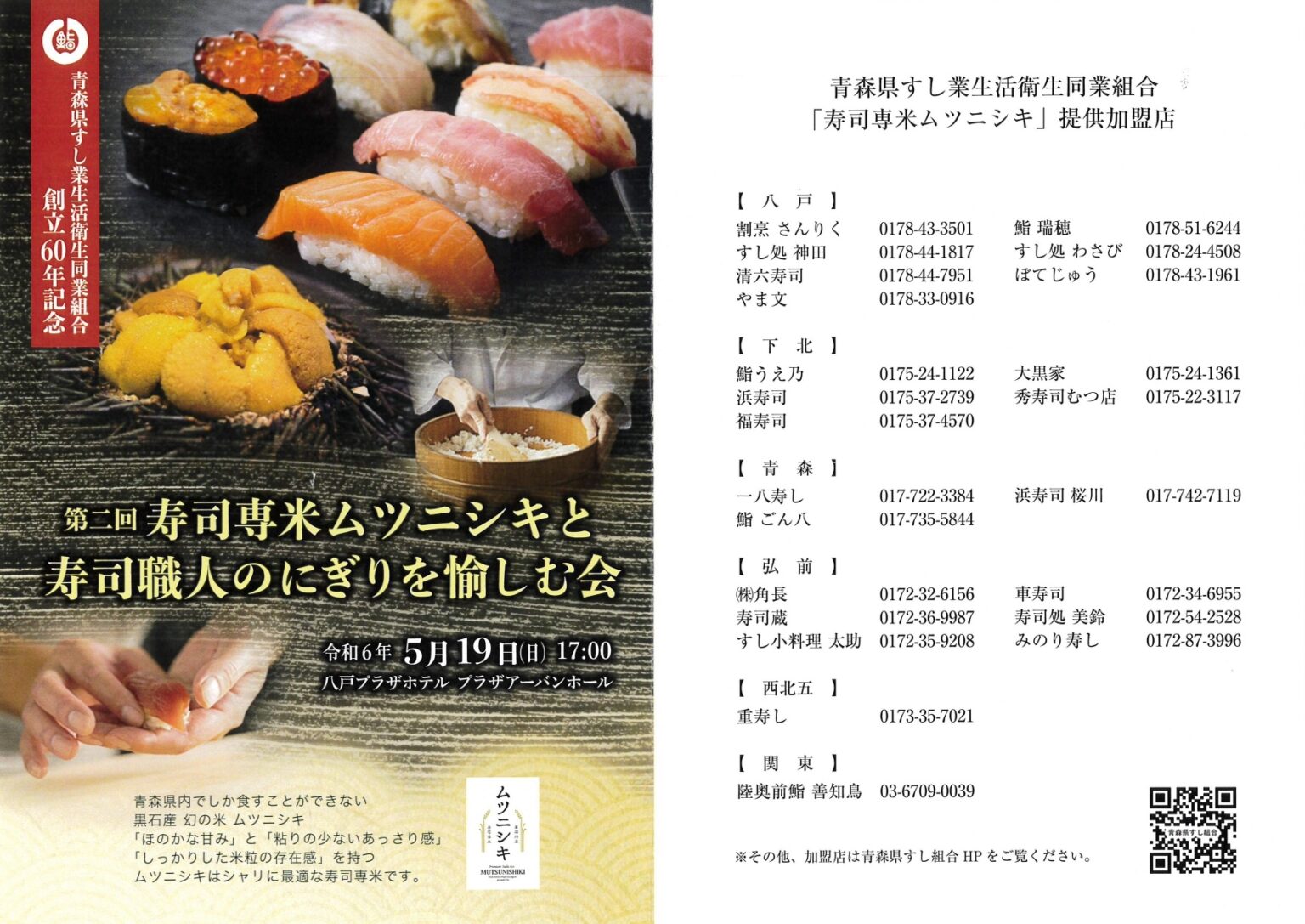 青森県すし業生活衛生同業組合の創立60年記念として第二回寿司専米ムツニシキと寿司職人のにぎりを愉しむ会が令和6年5月19日(日)17時より八戸プラザホテル アーバンホールにて約400名のお客様の中で執り行われました。私は … 続きを読む 2024(令6)寿司専米ムツニシキと寿司職人のにぎりを愉しむ会