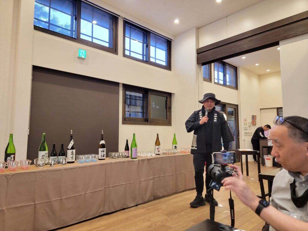 2025(令7)蔵で蔵出し酒の会、第1回の様子です。今回もMCは村上陽心(あききよ)です。小さくて見えますか?日本酒が日本酒が10種類並んでいます。一番左側の「北鹿」は2種類です。雪中貯蔵のお酒です。次は「亀吉」です。720mlは青天の霹靂で造った純米大吟醸でした。次は「田酒」。次は「豊盃」の花筏です。もう一つの「豊盃」の1.8Lは写真には写っていませんでした。次は弊社の「稲村屋純米吟醸かすみにごり酒」です。こちらが乾杯酒でした。次は「八仙」。一番右側は弊社の「純米吟醸中汲み久○(きゅうまる)」です。右側に写っているのは大学時代の同窓生の木村浩です。