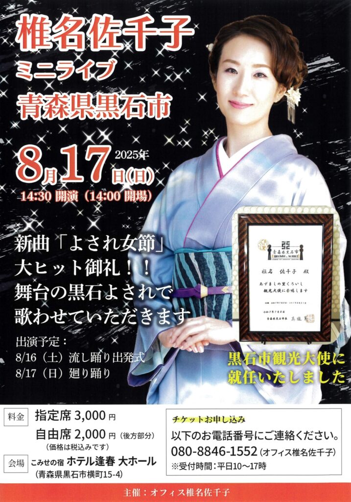 椎名佐千子さんのミニライブのお知らせです。令和7年8月17日(日)14:00開場、14:30開演です。