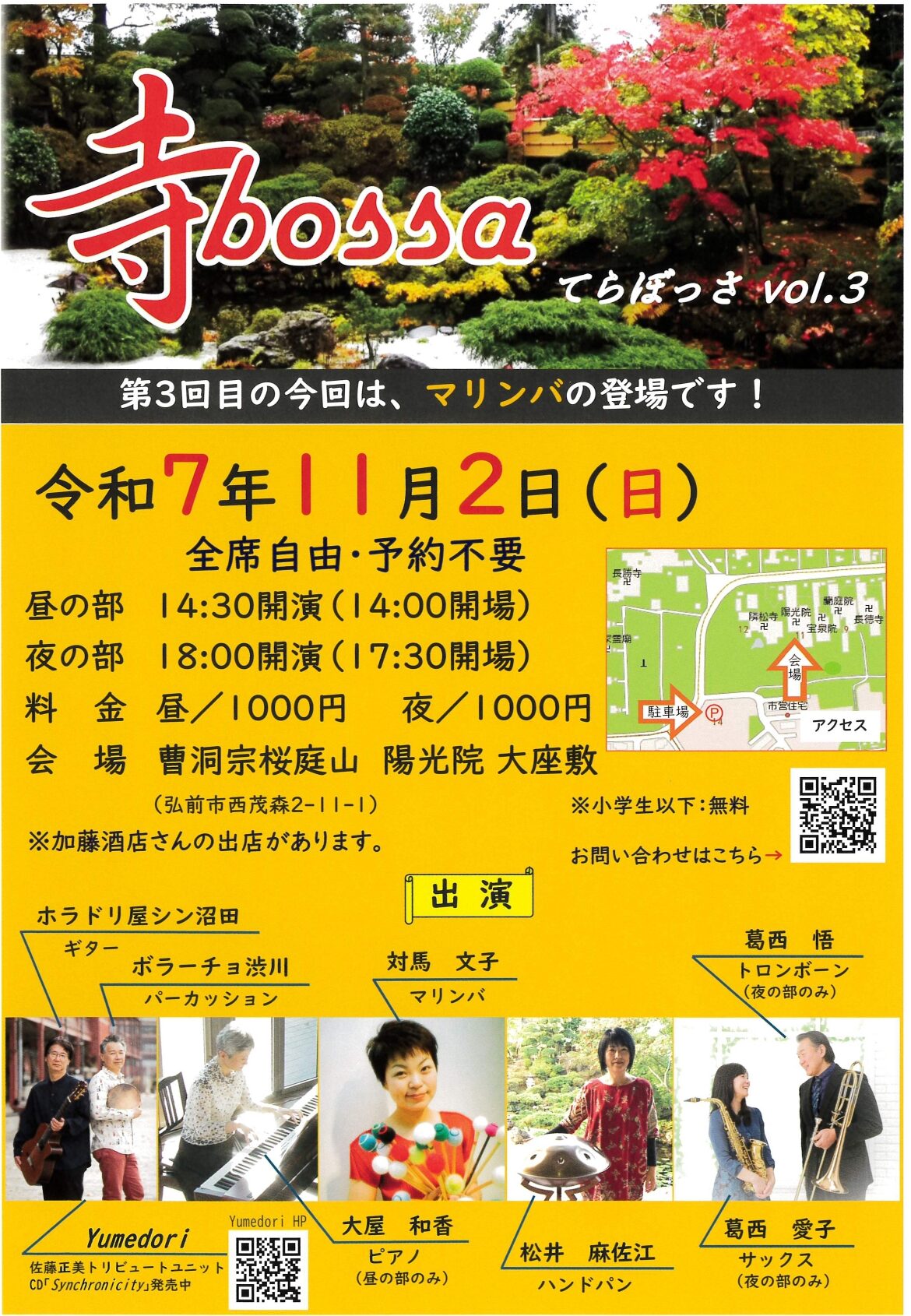 2025(令7)寺bossa(てらぼっさ)vol.3のチラシです。詳しくはチラシを拡大してご覧ください。または、昨年のブログに詳しく書いていますので参考にしていただきたいと思います。今年も弘前市の加藤酒店様で出店して鳴海醸造店の日本酒も提供されるみたいですのでそちらもよろしくお願いいたします。今では飲めない久○などもある予定です。