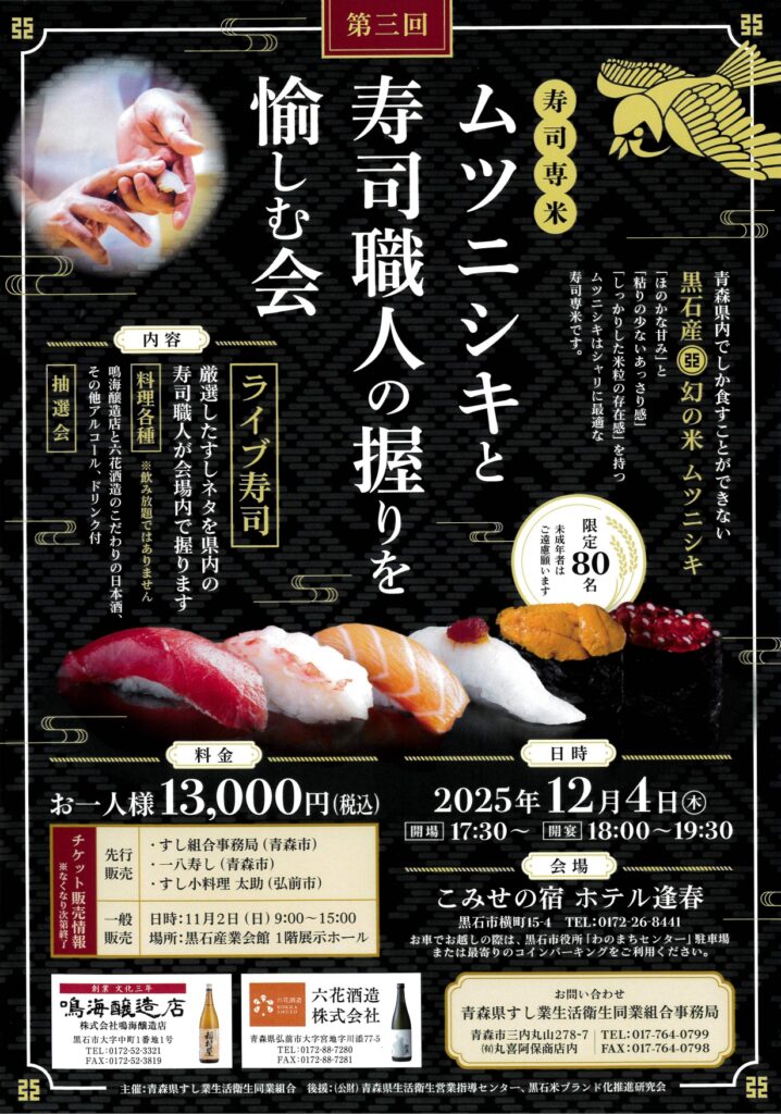 2025(令7)ムツニシキと寿司職人の握りを愉しむ会が開催されます。チケットはほぼ完売状態でした。