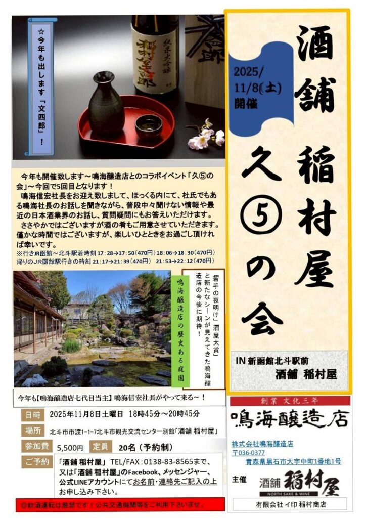 新函館北斗駅、酒舗稲村屋さんでの「酒舗稲村屋久⑤の会」のチラシです。