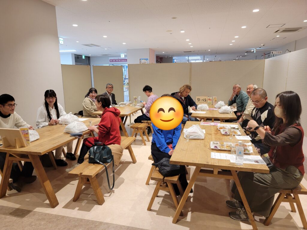 「酒舗稲村屋久⑤の会」の会場のお客様の様子です。全員で12名です。1テーブル席に3名ずつ。青色の服を着た方は写真NGでしたのでニコニコマークで隠させていただきました。