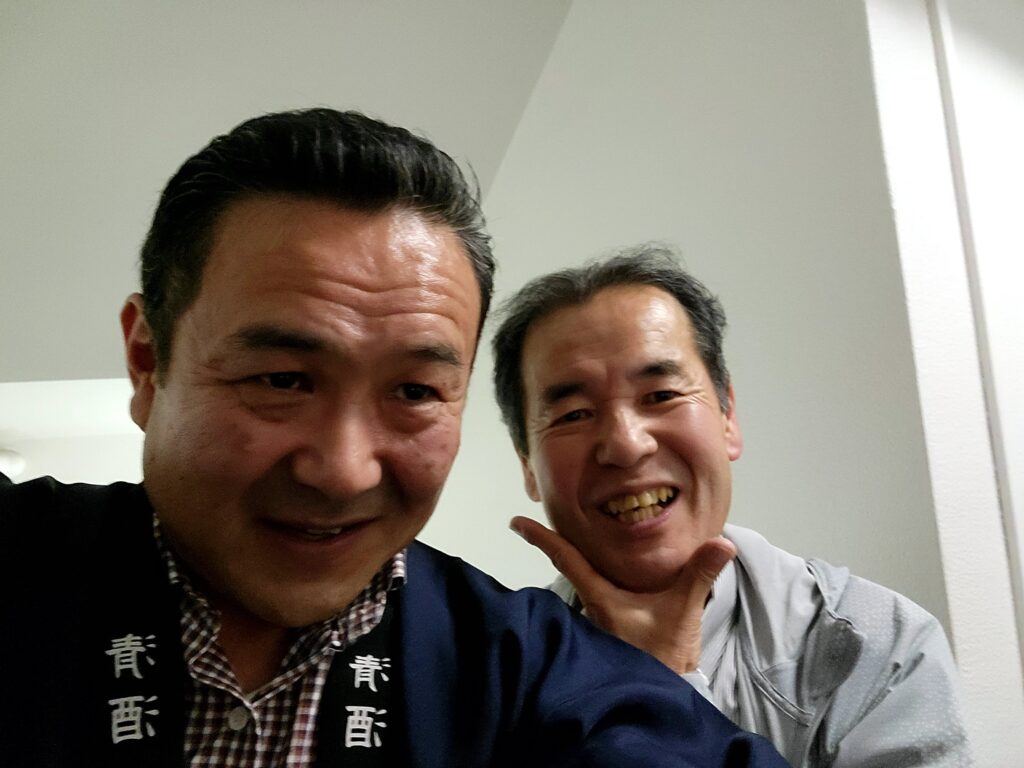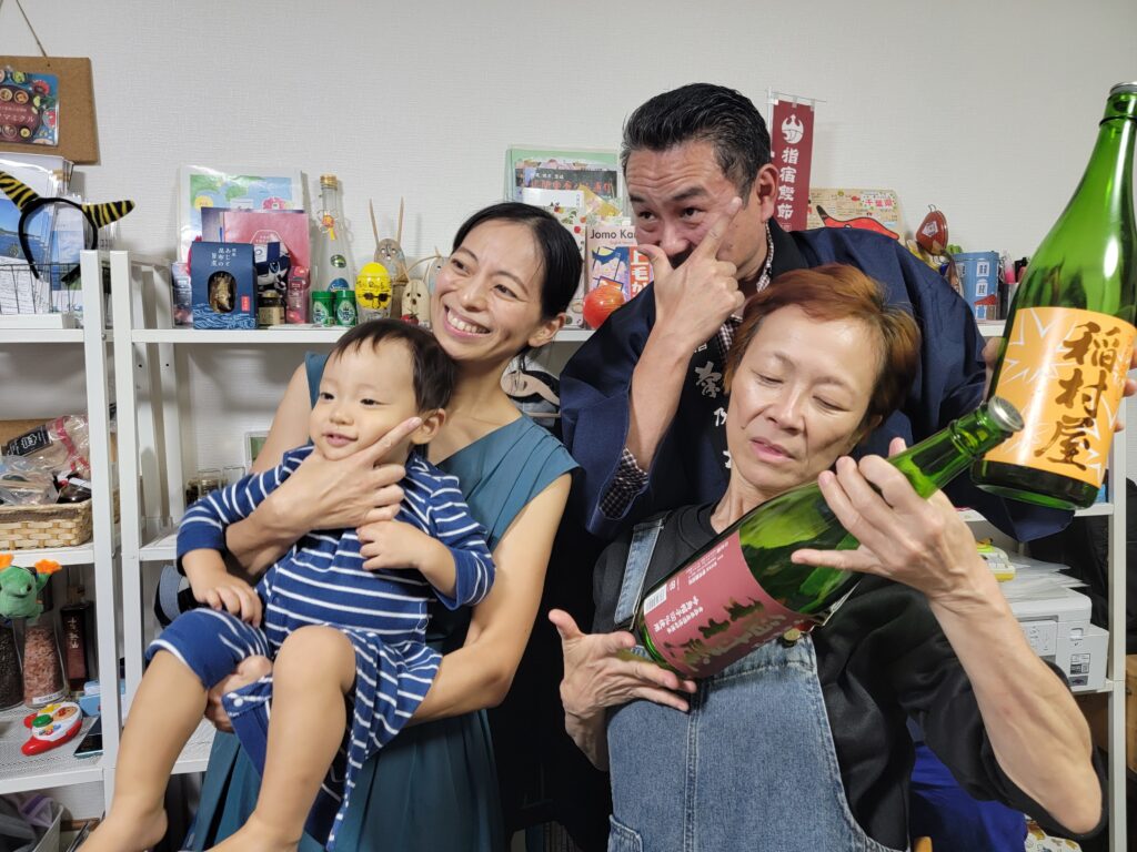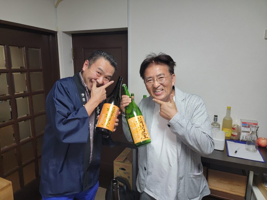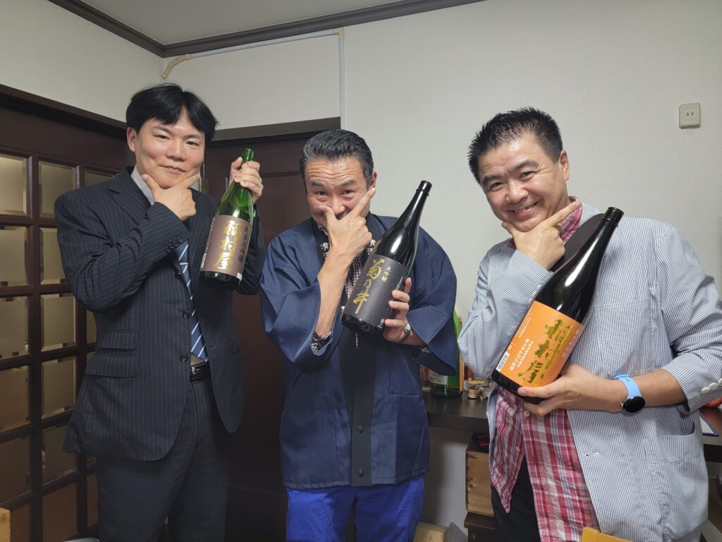 日本酒を持っての記念撮影です。「稲村屋」「菊乃井」の瓶を持ってのPR写真です。