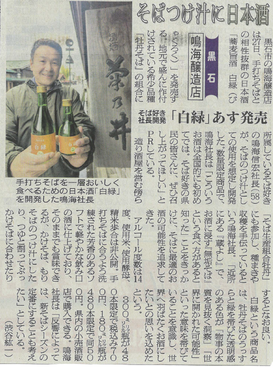白緑のネーミングは「そば生産組合牡丹」の会員でもある「奥村雅美」さんにお願いして命名してもらいました。以下「奥村雅美」さんのコメントです。「白緑(びゃくろく)」という名は、牡丹蕎麦がもつ“うっすらと緑を帯びた透明感のある色”に由来しています。古来、日本で白緑は品格・清廉・外交・調和 を象徴する色とされ、淡い緑を含む白は“物事の本質を見抜く洞察”の意味も持ちます。日本酒と蕎麦という伝統が持つ気品と、この色の象徴である“世界に開かれた可能性”を重ね、「気品と調和をまとい、世界へ羽ばたくお酒」という願いを込めて名付けました。また、今回の開発は、原料・味わい・製法を丁寧に見極める鳴海さんの高い洞察力があったからこそ生まれた一本 だと感じています。この“白緑”が、多くの方に長く愛され、大切に味わわれる存在となることを心から楽しみにしております。