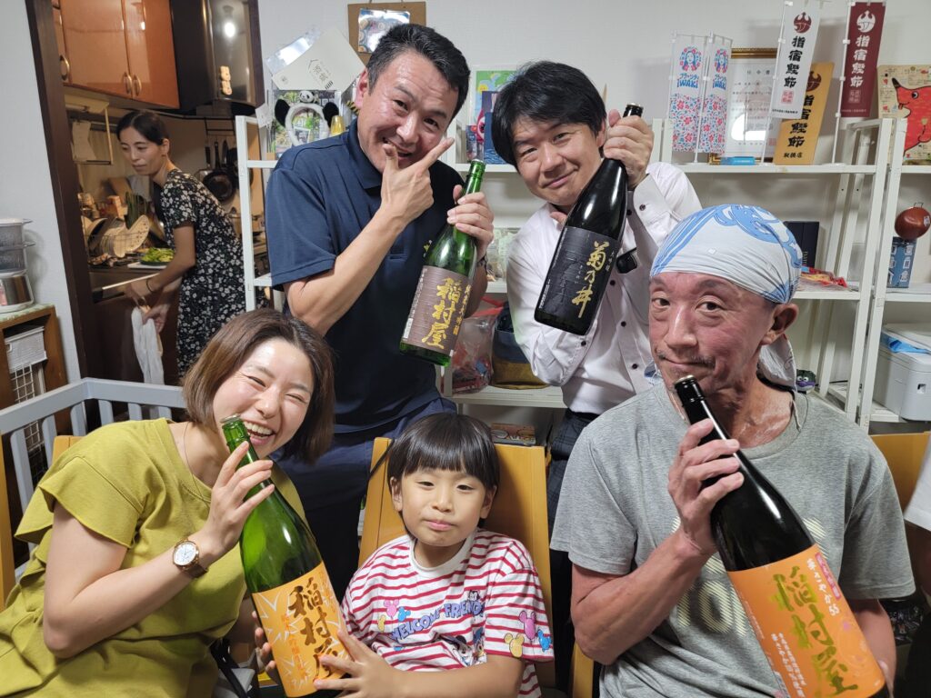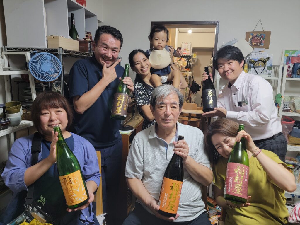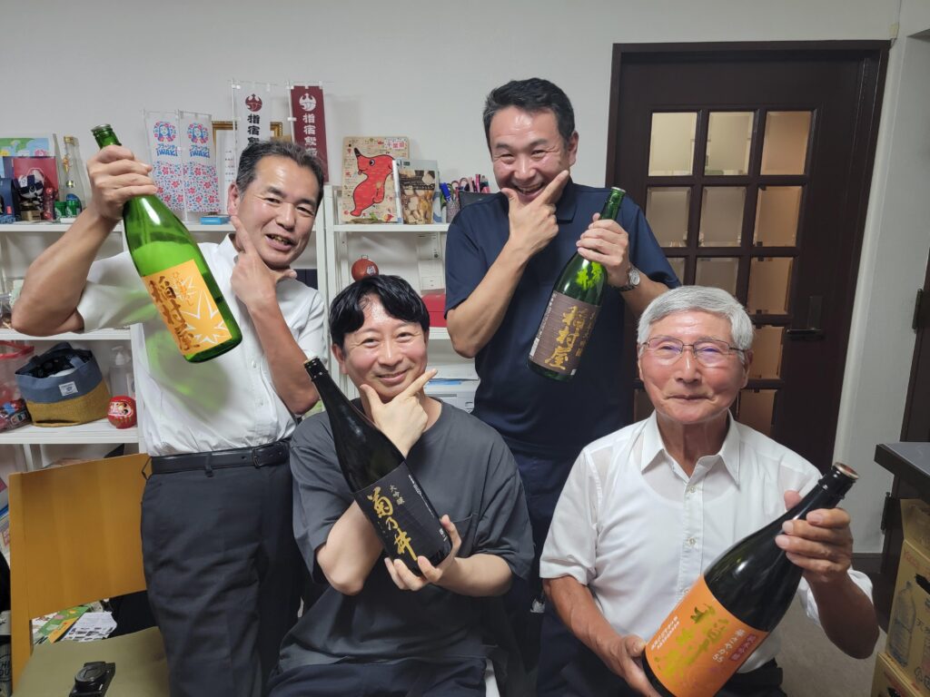 お酒の瓶を持ってPRです。「稲村屋」「菊乃井」のPRです。
