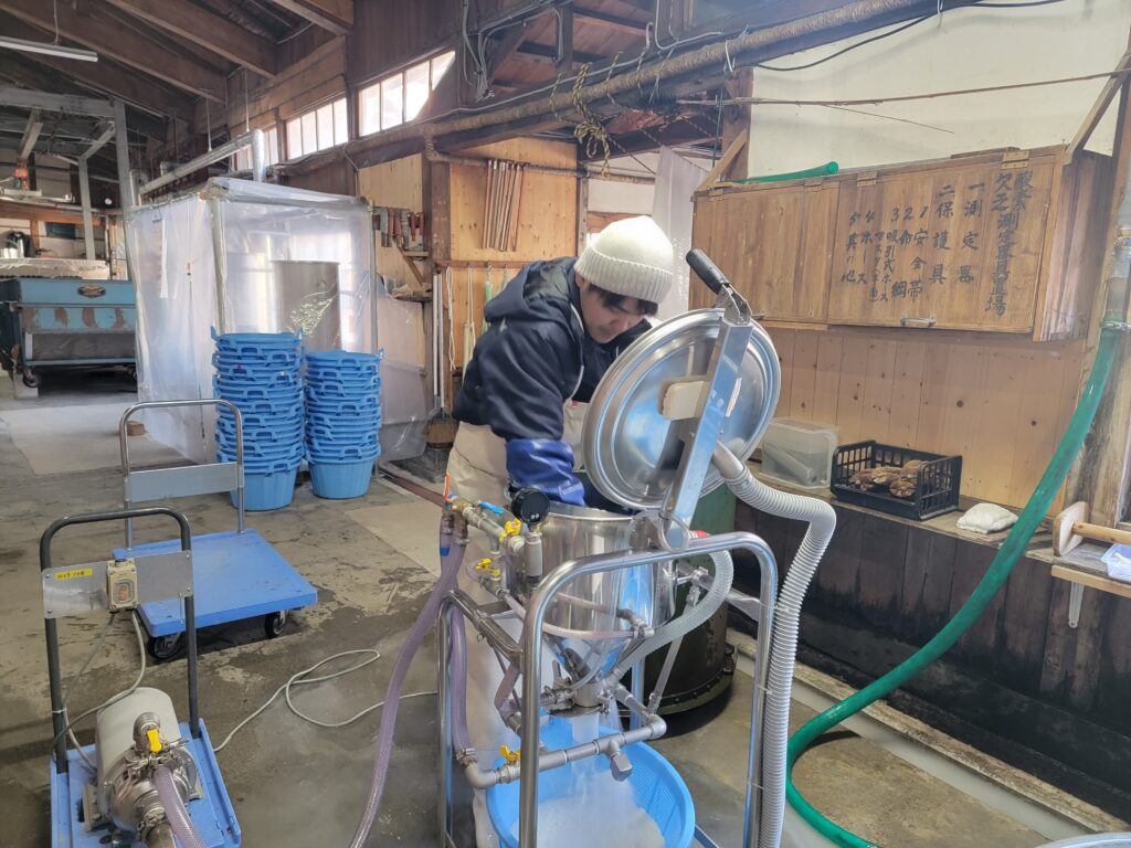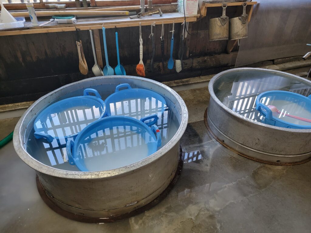 浸漬の様子です。半切りに冷たい水を溜めて浸漬します。浸漬時間は白米の吸水をみて変えていきます。最初の白米は酒母麹用の浸漬です。若干多く水分を吸いました。明日の蒸上がりをみて徐々に調整していきます。