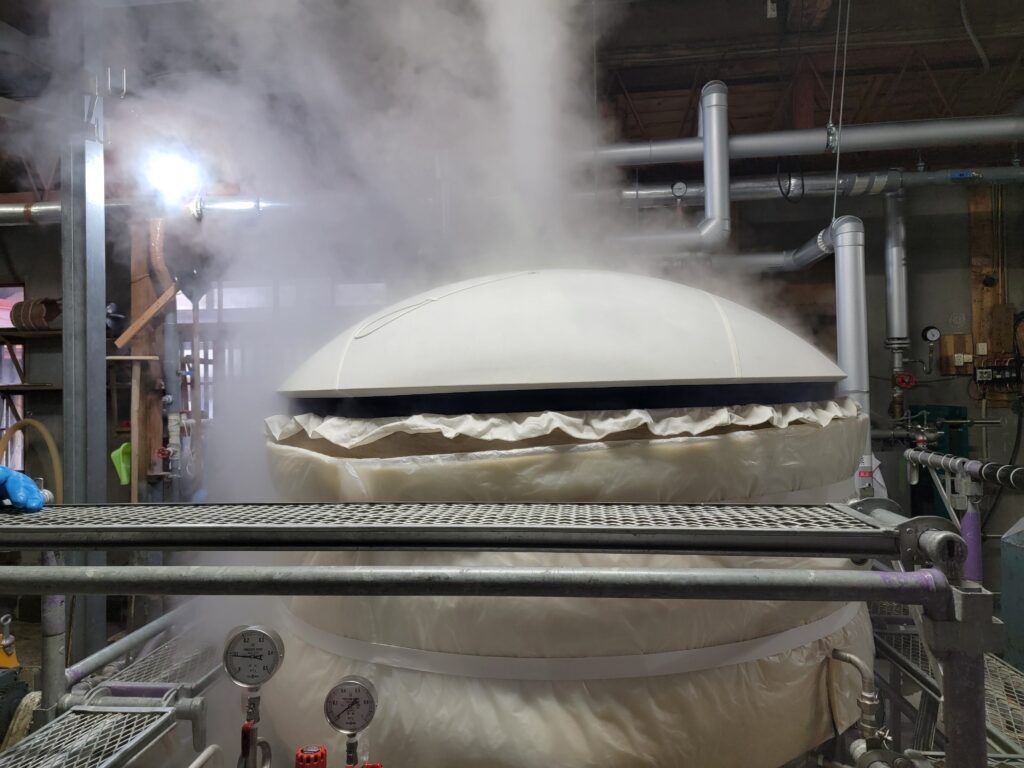 白米を蒸す作業です。蒸気が出てから約60分蒸します。