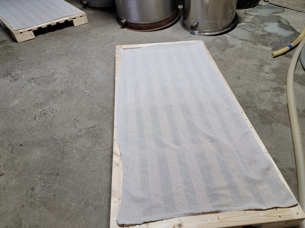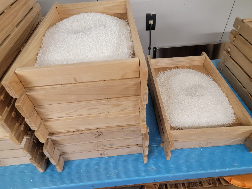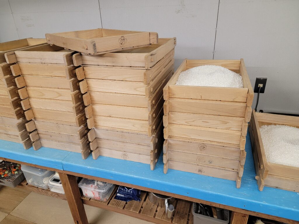 箱麴つくりです。今回の米は青森県産酒造好適米の「華想い」を使用です。精米歩合は40%です。白米は27kgでした。仲仕事という作業です。撮影は作業終了後に撮影されたものです。