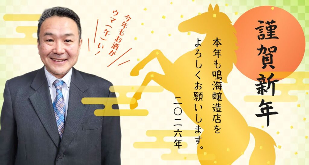 2026(令8)新年のご挨拶のPOPです。今年もお酒がウマ(午)いというダジャレを言っていますが今年はより洗練された日本酒を提供するように努力しています。鳴海醸造店の進化をみていただきたいと思います。2026年は鳴海醸造店にとって創業220年という節目の年です。記念酒も限定で造る予定です。お楽しみにしてください。