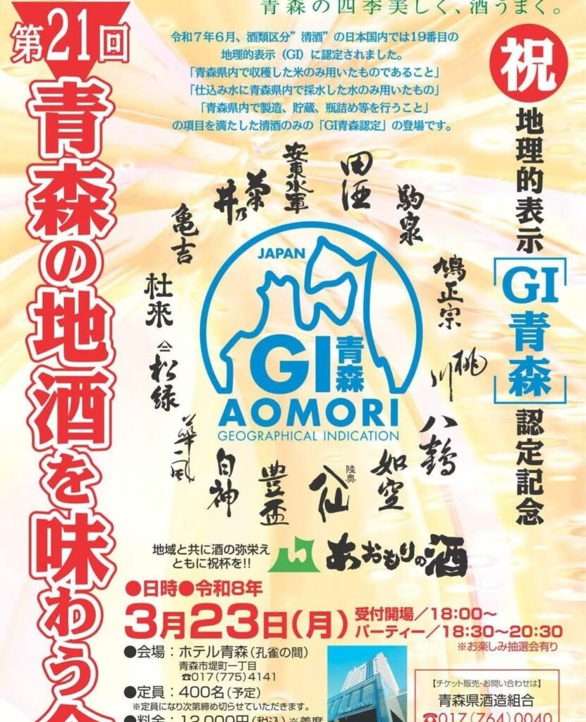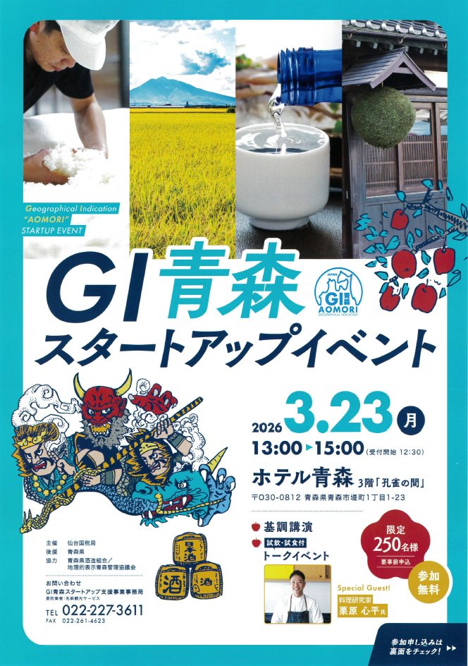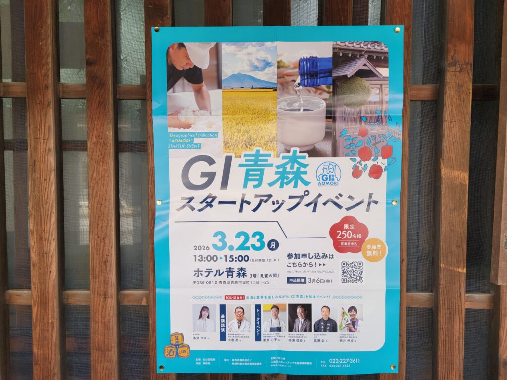 GIスタートアップイベントが令和8年3月23日(月)13時よりホテル青森の孔雀の間で開催されます。基調講演やトークイベントが行われます。試飲・試食付で参加費は無料です。ただし事前申し込みが必要で限定250名となります。参加したいと思う方は早めにお問い合わせ先にお申込みください。申込締切は3月6日(金)です。まだ若干余裕があるとのことです。品切れしたらごめんなさいね。