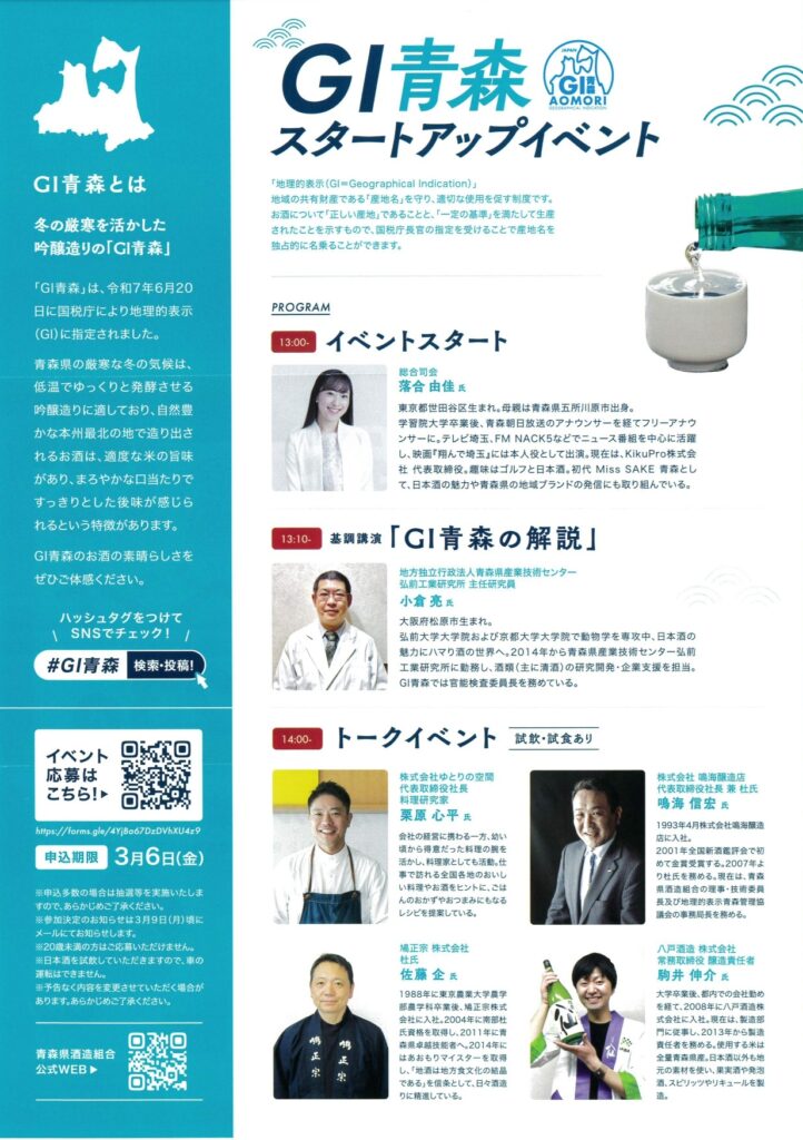 2026(令8)GIスタートアップイベントチラシの裏面です。総合司会は落合由佳さんです。基調講演は「GI青森の解説」と称して地方独立行政法人青森県産業技術センターの小倉亮さんが務めます。トークイベントでは株式会社ゆとりの空間代表取締役社長料理研究家の栗原心平さんと鳩正宗株式会社の杜氏佐藤企さんと八戸酒造株式会社常務取締役醸造責任者の駒井伸介さんそして私鳴海醸造店の代表取締役社長兼杜氏の鳴海信宏がトークイベントに参加します。