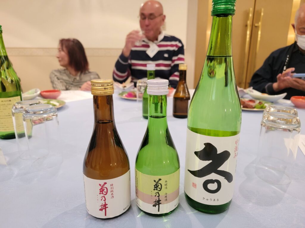 2026(令8)黒石地酒をたしなむ会3月乾杯酒は、純米吟醸中汲み久○(きゅうまる)です。一番右側の商品です。真ん中は菊乃井本醸造冷用酒300mlです。左側は菊乃井特別純米酒300mlです。熱燗の好きな方のテーブル席には菊乃井上撰180mlが燗付されて事務局が持参しています。