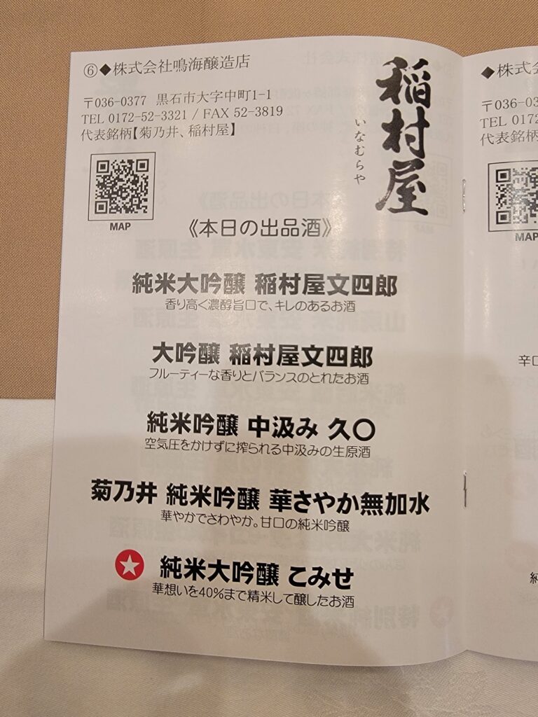 第21回青森の地酒を味わう会の鳴海醸造店のブースです。今年も長男と2人でブースに立ちました。左側から純米吟醸中汲み久〇(きゅうまる)、大吟醸稲村屋文四郎、純米大吟醸稲村屋文四郎、純米大吟醸こみせ、菊乃井純米吟醸華さやか無加水です。ウエルカムドリンクは純米大吟醸こみせでした。