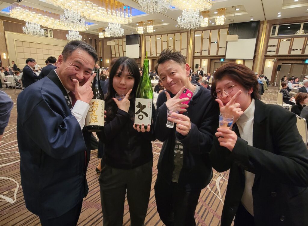 工藤さんの仲間と記念撮影しました。工藤さんたちは黒石市で開催した「蔵で蔵出し酒の会」にも参加してくれました。