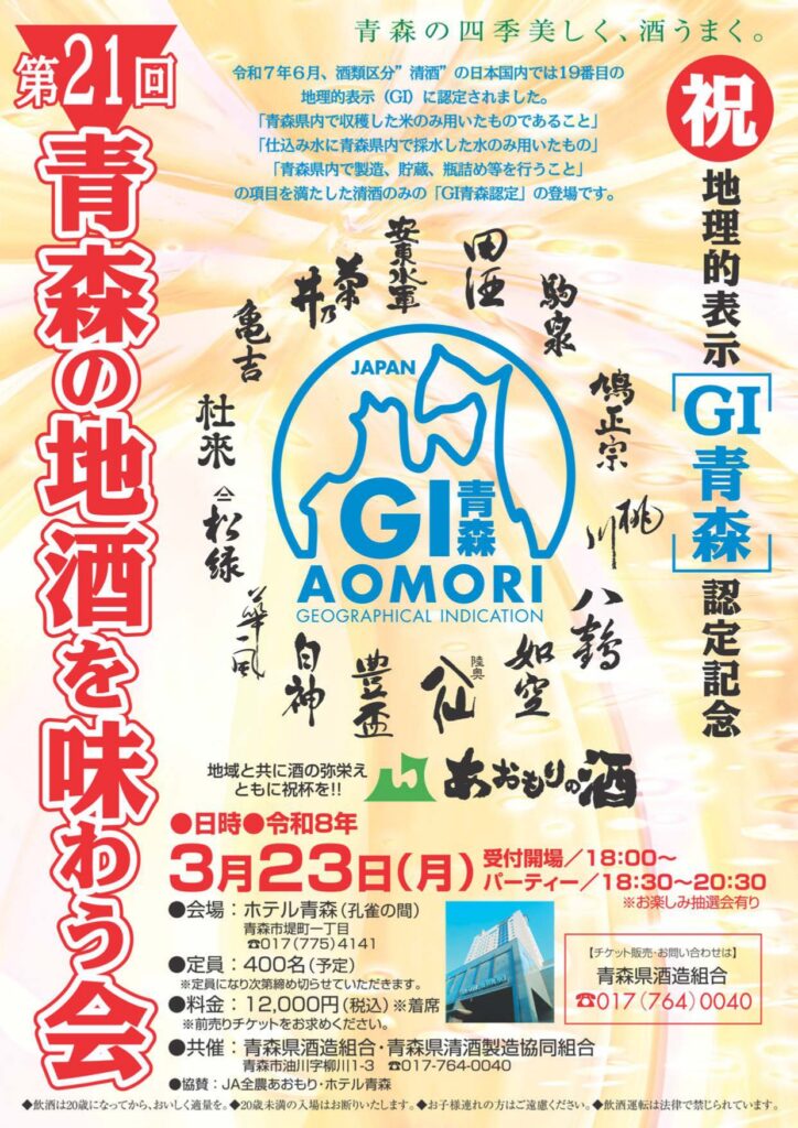 第21回青森の地酒を味わう会がホテル青森の孔雀の間で令和8年3月23日(月)に開催されました。こちらのブログではその内容を簡単に掲載しています。お時間のある方はご覧くださいね。