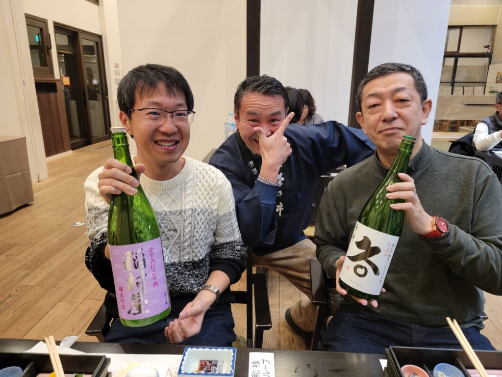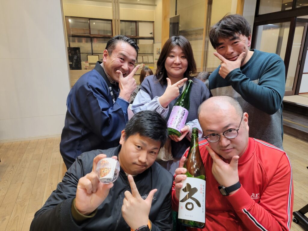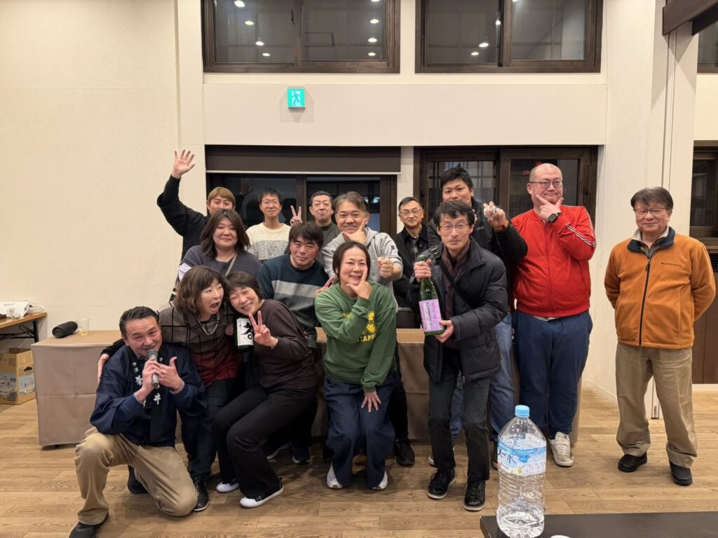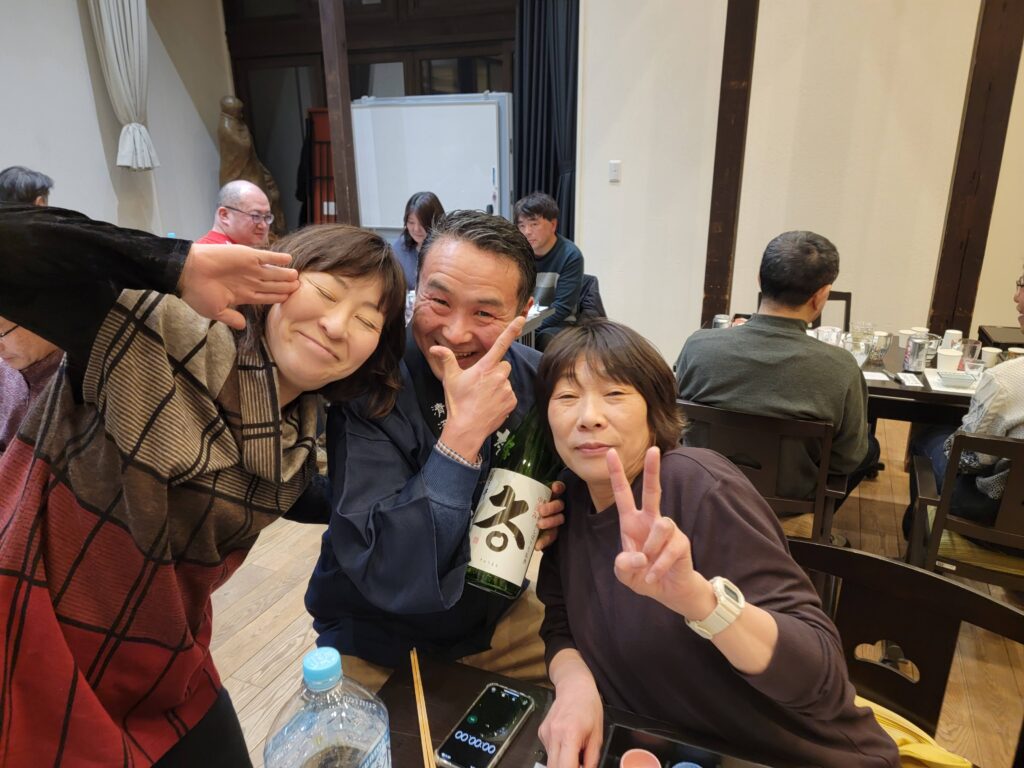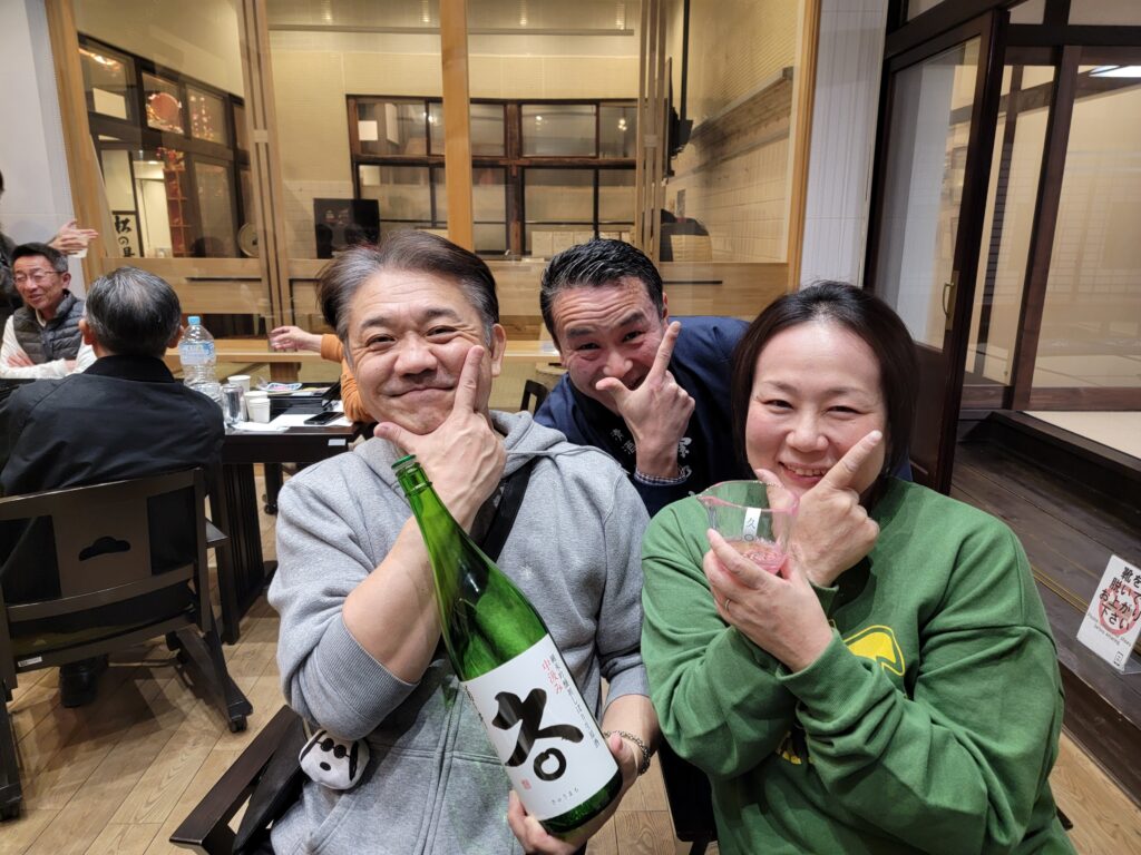 2026(令8)蔵で蔵出し酒の会、第1回お客様の様子です。藤崎町から毎回のように参加していただいています。「なるみんポーズ」でパシャリ。