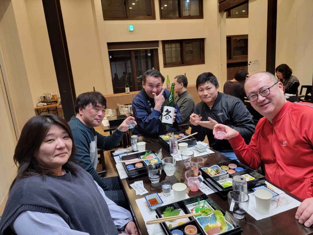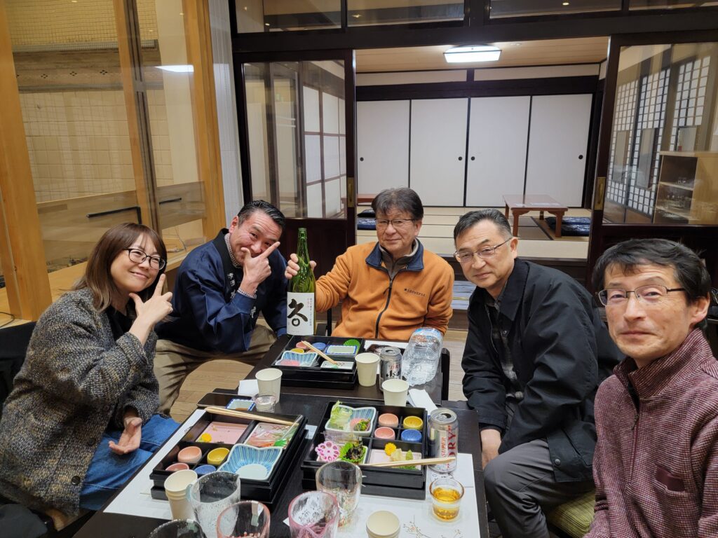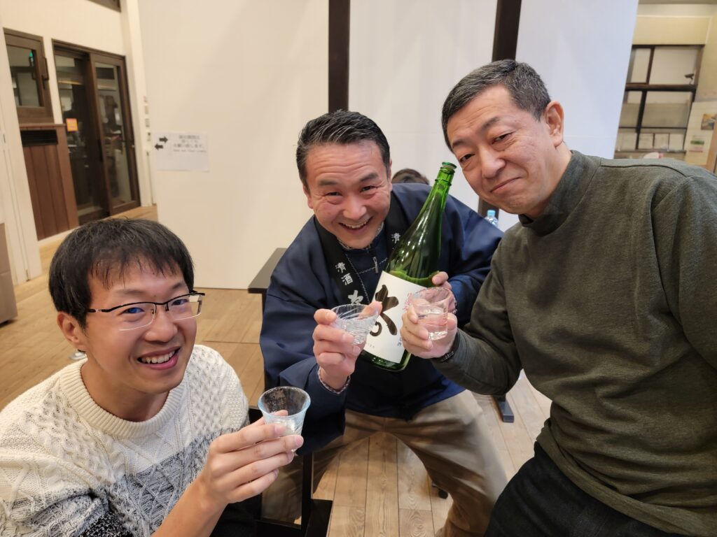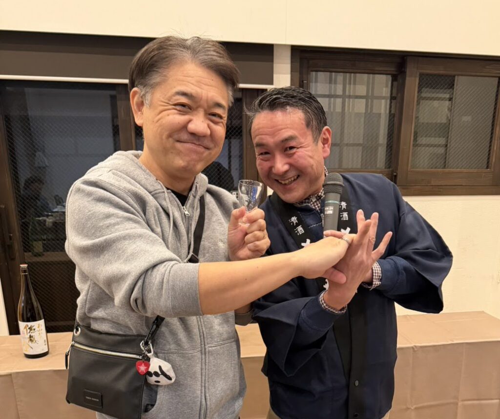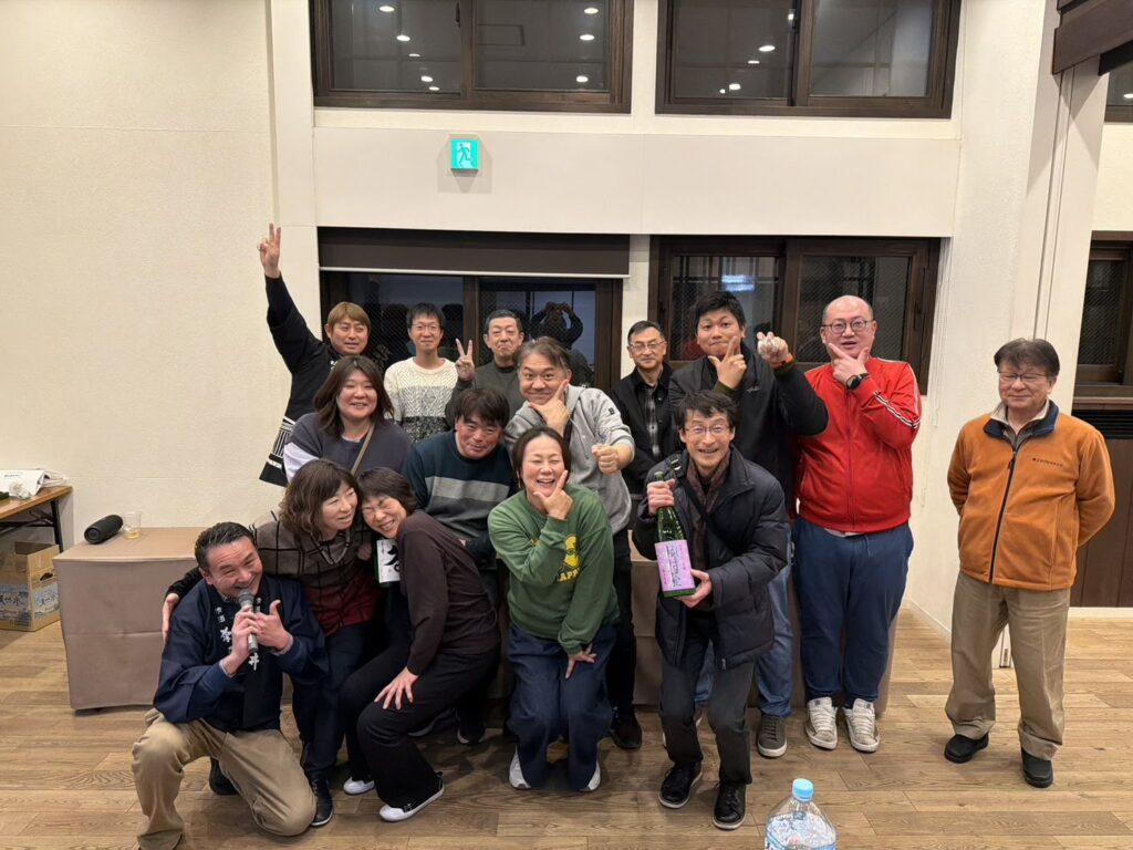 2026(令8)蔵で蔵出し酒の会、第1回お客様の様子です。藤崎町から毎回のように参加していただいています。「なるみんポーズ」でパシャリ。