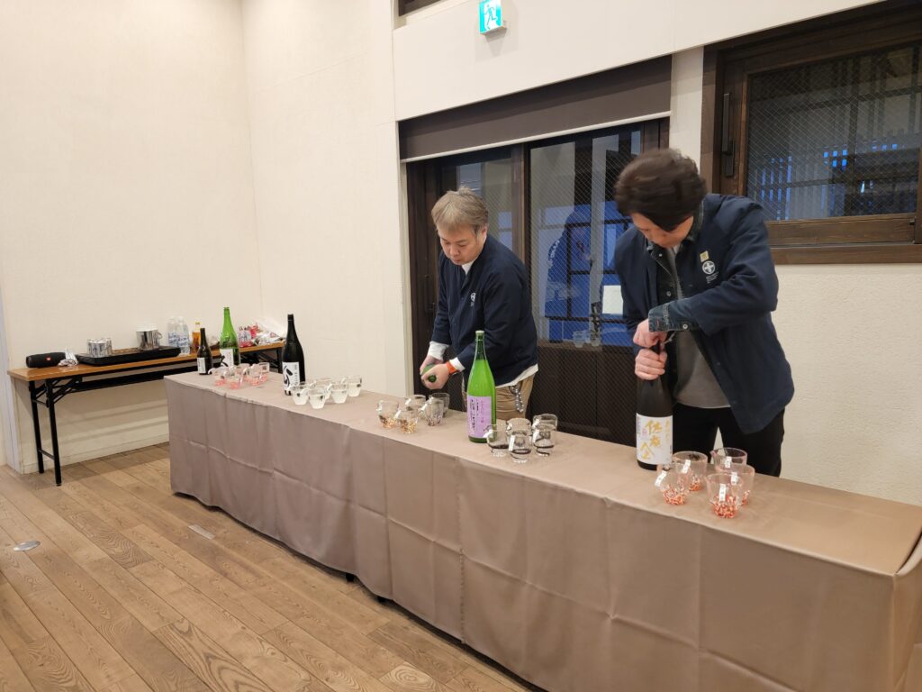 スタッフの準備の様子です。NPO法人横町十文字まちそだて会のお手伝いです。青森県の地酒が置いてあります。鳴海醸造店は今回2種類の日本酒が選ばれました。稲村屋純米吟醸かすみにごり酒と純米吟醸中汲み久○(きゅうまる)です。