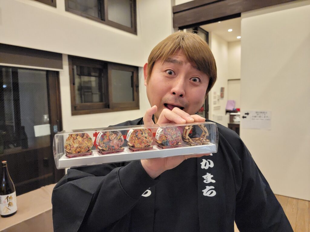 MCの村上陽心さんです。きき酒などのクイズがあり優勝者には写真の景品がプレゼントされました。ねぷたのミニチュアですね。松の湯交流館の館長は今井秋行さんで自身もねぷた絵師として活躍されています。