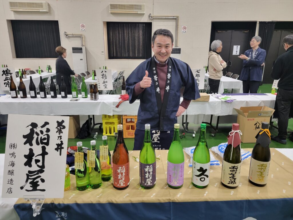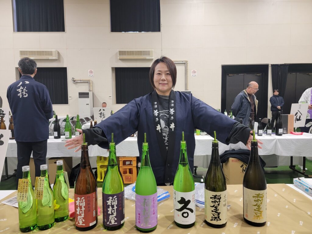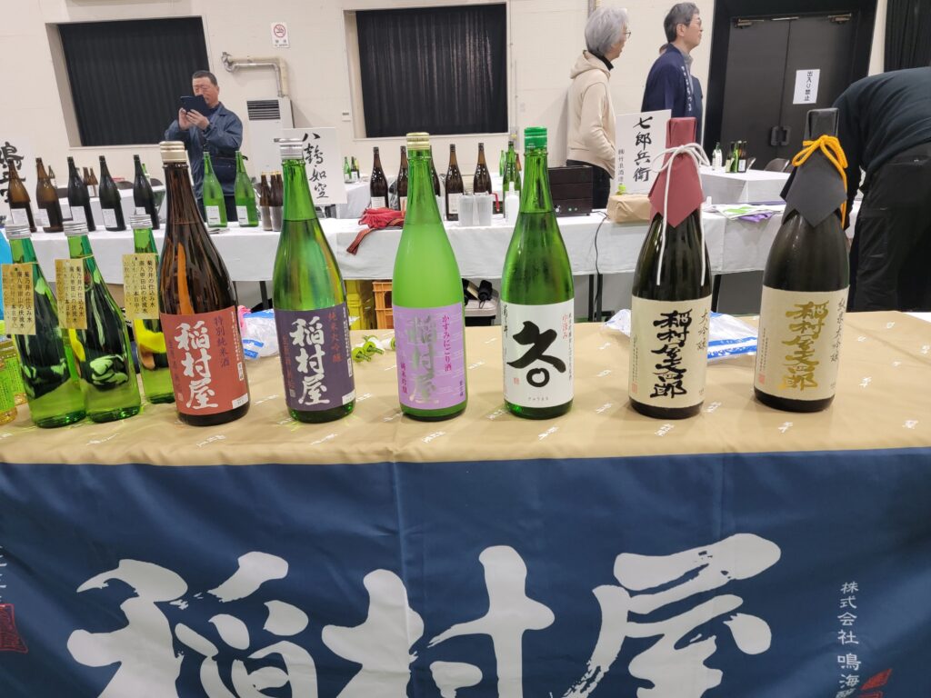 鳴海醸造店のブースです。右側から「純米大吟醸稲村屋文四郎」「大吟醸稲村屋文四郎」「純米吟醸中汲み久○」「稲村屋純米吟醸かすみにごり酒」「稲村屋純米大吟醸生原酒無垢」「稲村屋特別純米生原酒無垢」です。一番人気は「純米大吟醸稲村屋文四郎」です。