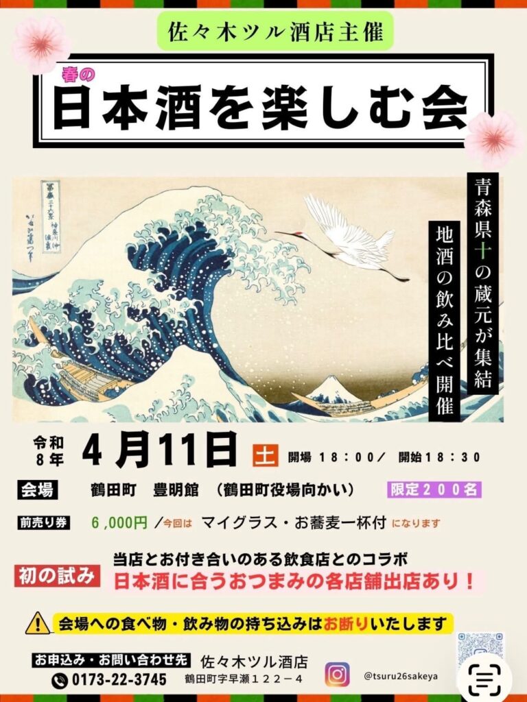 令和8年4月11日(土)佐々木ツル酒店さん主催の日本酒を楽しむ会が鶴田町の豊明館で18時30分から開催されました。参加人数は約200名です。その内容を簡単にブログにしました。お時間のある方はご覧ください。