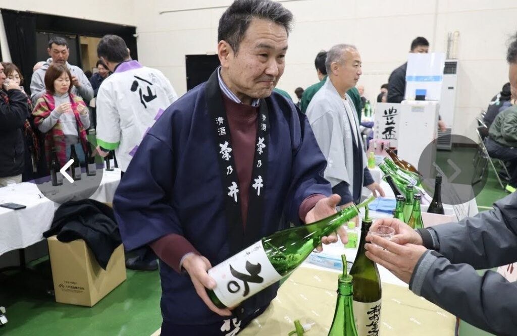 2026(令8)佐々木ツル酒店 日本酒を楽しむ会の接客の様子です。久〇(きゅうまる)をお注ぎする様子です。