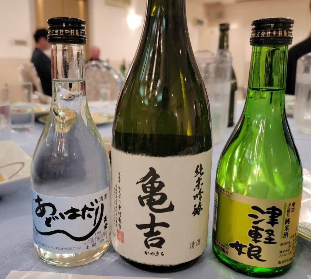 2026(令8)黒石地酒をたしなむ会4月例会の日本酒です。真ん中が今月の乾杯酒で「亀吉の純米吟醸」です。今年の新酒みたいです。