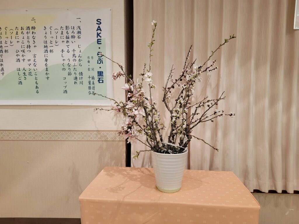 2026(令8)黒石地酒をたしなむ会4月例会が第三水曜日の15日に開催されました。今月は花見例会で中村亀吉酒造店の担当でした。参加者はなんと52名でした。内4名はお試し会員で来月出席すると正会員になります。1回の会費は男性4,000円、女性3,500円です。年会費は数千円です。