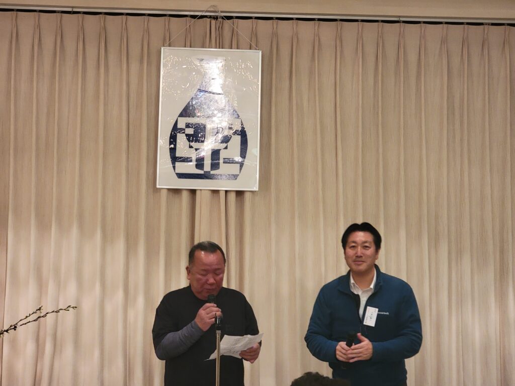 会歌「SAKE・らぶ・黒石」斉唱の様子です。左側が千葉勝弘さんで右側が黒石税務署の総務課長の工藤智人さんです。