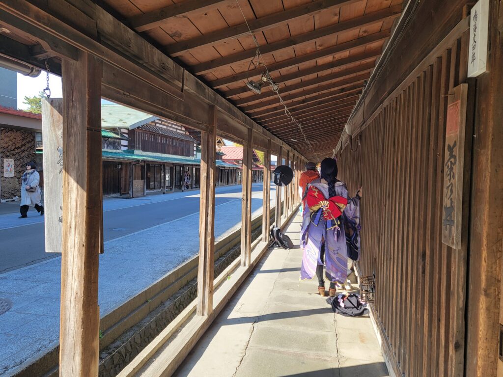 こみせ通りでの撮影の様子です。こみせを背景に撮影は絵になりますね。カメラマンが居て一生懸命に撮影していました。その写真を見て「こみせ通り」にたくさんのお客様が来て欲しいと思います。